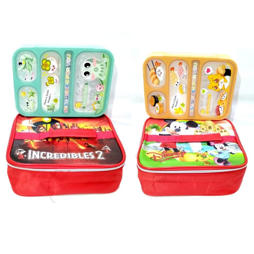 Lunch Box Sekat 6 Grid Karakter6sekat (5 sekat untuk makanan dan 1 sekat dapat di taruh sumpit kecil)- 100% brand new- Food Grade PP BPA FreeDimensi (PxLxT) = 23 x 17 x 4.6cm (1000 ml)- Ditutupnya terdapat karet antar sekat, sehingga makanan tidak bercampur- Bahan plastik tebal BPA Free- Tahan panas sampai 120 degC- Dilengkapi sendok dan sumpit- Terbuat dari bahan yang berkualitas untuk makanan, aman dan tidak membahayakan- Tidak berbau plastik bahkan menggunakan air mendidih di dalamnya- Bahan berkualitas yang tahan terhadap panas atau dingin- Dapat digunakan untuk pemasanan menggunakan microwave, menyimpan pada kulkas, dan mesin cuci piring (Dishwasher)- Tahan panas sampai 120c- anti tumpah nya dimana makanan yang kita masukkan tidak akan tumpah atau tercampur dengan makanan yang ada di sekat lainya.Lunch Bag KarakterTerdapat alumunium foil didalamnya untuk menjaga suhu makanannyaNOTE: BARANG READY yaa, Keterangan PO hanya untuk menghindari cancel otomatis dari Shopee#kotak