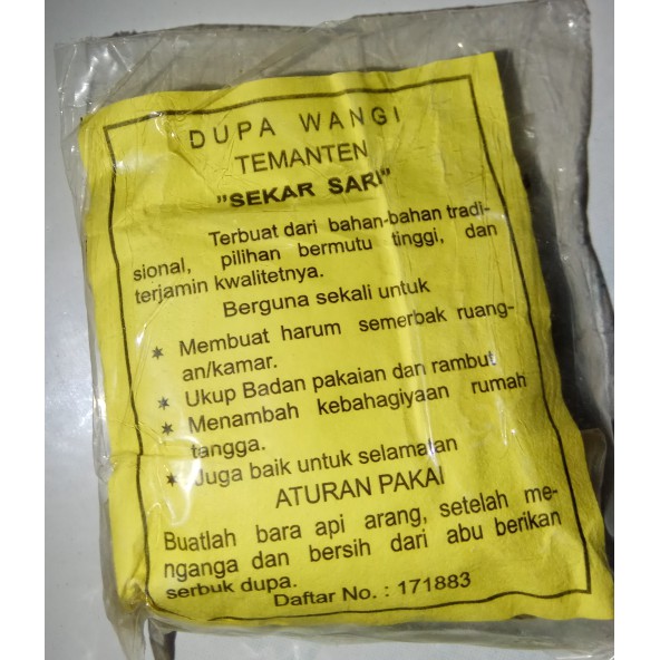 1pack isi 10 bungkusDupa Wangi Temanten "Sekar Sari" terbuat dari bahan-bahan tradisional, pilihan bermutu tinggi, dan terjamin kualitasnya.*Khasiat :1. Membuat harum semerbak ruangan/kamar2. Ukup badan, pakaian dan rambut3. Menambah kebahagiaan rumah tangga4. Juga baik untuk selamatan*Aturan Pakai :Buatlah bara api arang, setelah menganga dan bersih dari abu berikan serbuk