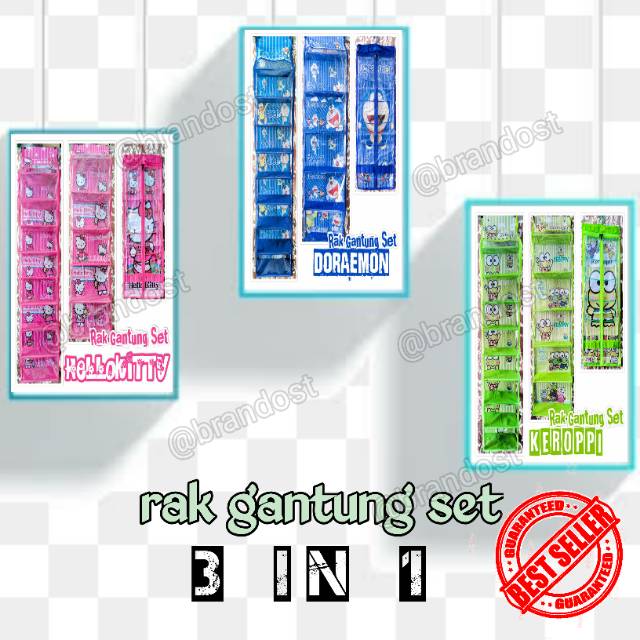 Rak set 3 in 1Terdiri dari:Rak tasRak sepatuRak hijabKarakter ready:Doraemon (biru)Hellokity (pink)Keropi (hijau) Rak tas terdiri dari 5 susun, di samping kanan dan kirinya terdapat full resleting. Rak sepatu terdiri dari 9 susun, di samping kiri dan kanan nya terdapat full resleting. Rak hijab terdapat hanger besi 5 susun, ditengahnya terdapat resleting. Catatan: Sebelum dikirim, barang di cek terlebih dahulu, supaya tidak ada barang yang rusak. Sebelum order, harap ditanyakan stok terlebih dahulu. Orderan yang masuk sebelum jam 16:00, akan kami kirimkan di hari yang sama (kecuali ada kendala). Terimakasih sudah mampir ditoko kami, salam hangat dan semoga baha